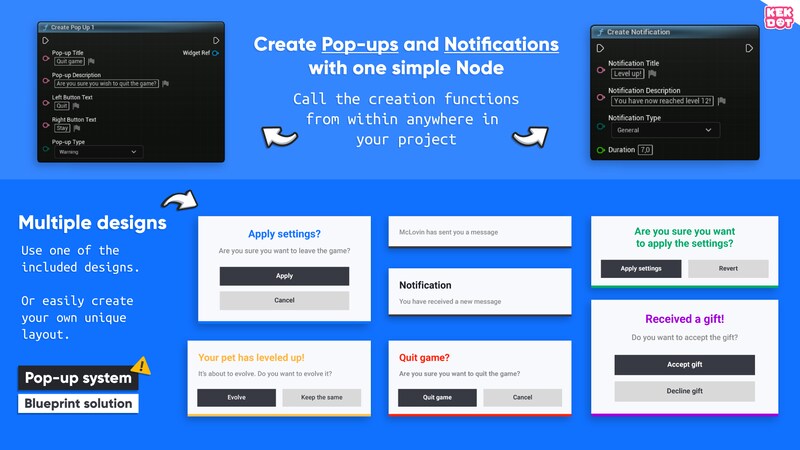 简介 ![]() Supported Engine Versions 5.0 Create Pop-ups and Notifications from anywhere within your project with one single node. 100% blueprints, easy to use and modify. Code any Pop-up functionality you require. Multiple designs are included which can easily be modified to your own unique layouts and style. The product is well commented and optimized for easy integration into your own project Documentation: https://www.youtube.com/watch?v=_oQoM-qG6MY&feature=youtu.be |